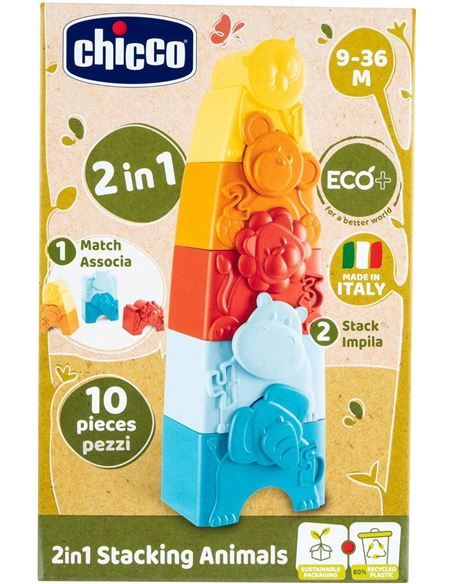 Inicia el viaje hacia el desarrollo sensorial y motor de tu bebé con el "TORRE APILABLE 2 EN 1 ANIMALITOS ECO+" de CHICCO. Este juguete, diseñado con atención y cariño, es ideal para que los más pequeños exploren texturas y colores mientras se divierten apilando y descubriendo animalitos.